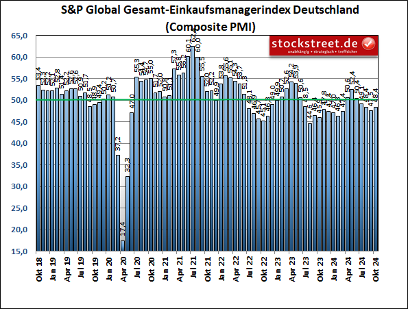 Die deutsche Wirtschaft hat ihre Talfahrt im Oktober offenbar abgebremst. Darauf deutet zumindest der Einkaufsmanagerindex für die gesamte Privatwirtschaft hin – also Industrie und Dienstleister zusammen. Dieser legte laut der monatlichen Umfrage von S&P Global um 0,9 auf 48,4 Punkte zu. Er erholte sich damit von zuvor 4 Rückgängen in Folge, die den Frühindikator auf ein 7-Monats-Tief gedrückt hatten. Das Stimmungsbarometer blieb allerdings trotz des aktuellen Anstiegs deutlich unterhalb der Marke von 50, ab der es Wachstum signalisiert.