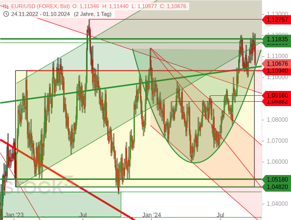 Fällt der EUR/USD in seine Seitwärtsspanne (gelb) zurück, kann sich die mögliche große Trendwende noch etwas hinziehen. An dieser muss man erst zweifeln, wenn die Kurse auch unter die alten horizontalen Widerstände bei 1,0916 bzw. 1,08882 USD geraten. Dann wäre der Wechselkurs in den Bereich der Bodenbildung der Wendeformation (grüner Bogen) zurückgerutscht. Und in diesem Fall müsste man damit rechnen, dass es bei einer Seitwärtstendenz bleibt, was durchaus auch zu der gleichbleibenden Zinsdifferenz passen würde.