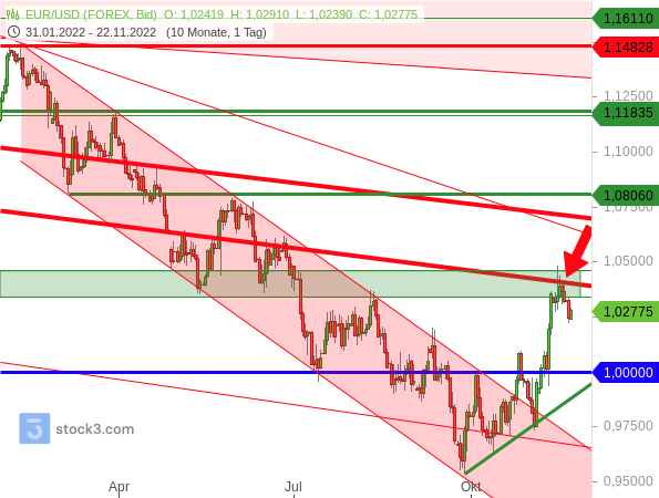 Nach den zuvor starken Wechselkursgewinnen war ein solcher Rücksetzer aber charttechnisch zu erwarten. Und daher hat sich nicht viel geändert, auch nicht gegenüber der EUR/USD-Analyse vom Freitag (siehe „EUR/USD: Trendbruch nachhaltig“). Die Kurserholung ist noch intakt, solange die Notierungen nicht erneut bis zur Parität bzw. unter das Zwischenhoch vom 27. Oktober bei 1,0094 USD abrutschen.