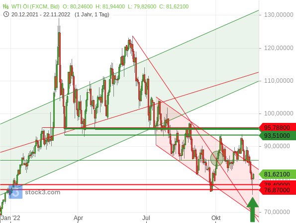 Angesichts dieser Preisentwicklung und der damit drohenden weitergehenden Preisschwäche scheint es aus Sicht der OPEC+ doch eine sinnvolle Maßnahme gewesen zu sein, Anfang Oktober eine Reduzierung der Förderquoten um 2 Millionen Barrel pro Tag (bpd) zu beschließen (siehe auch Börse-Intern vom 5. Oktober). Denn schon damals hatte der Ölpreis der US-amerikanischen Sorte West Texas Intermediate (WTI) beinahe die horizontalen Marken bei 78,4 und 76,87 USD unterschritten (rote horizontale Linien), was im Erfolgsfall angesichts des dann charttechnisch bearishen Signals womöglich weitere Kursverluste nach sich gezogen hätte.