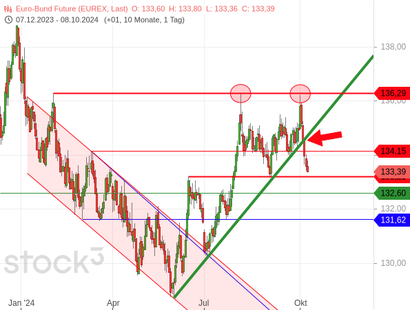 Damals war die Aufwärtstrendlinie allerdings noch intakt und bildete mit dem Hoch zusammen eine Kreuzunterstützung. Die Bullen könnten es nun also etwas schwerer haben, den Kursrückgang zu beenden. Wenn dies aber gelingt, könnte sich ein neuer Long-Trade anbieten mit Kursziel 136,29 Punkten. Denn die Zinssenkungen der Europäischen Zentralbank (EZB) werden sich aller Voraussicht nach fortsetzen, was die Anleihekurse tendenziell wieder nach oben treiben sollte, wenn auch in einem moderaten Tempo.