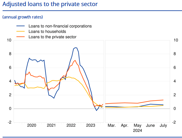Ein Grund für diese Entwicklung sind die relativ hohen Zinsen. Denn diese bremsen die Kreditvergabe (was auch deren Ziel ist). Die Banken der Eurozone reichten im Juli lediglich 0,6 % mehr Darlehen an Firmen aus als ein Jahr zuvor. Im Juni hatte das Wachstum mit 0,7 % noch etwas höher gelegen. An die Privathaushalte vergaben die Banken 0,5 % mehr Darlehen, nach einem Plus von 0,3 % im Juni.