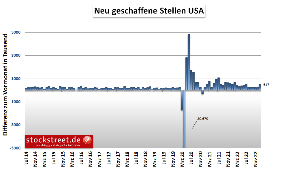 Konkret wurden rund 517.000 neue Stellen (außerhalb der Landwirtschaft) geschaffen. Das war weit mehr als die durchschnittlich erwarteten 185.000 und der höchste Wert seit Juli vergangenen Jahres. Zudem wurden die Zahlen von Dezember und November um insgesamt 71.000 nach oben revidiert.