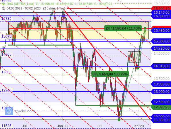 Zumal der DAX an einer markanten Hürde steht. Denn er hat nach einem Anstieg von mehr als 11 % seit Jahresbeginn (!) bzw. mehr als 30 % (!) seit dem Korrekturtief von Ende September inzwischen bei 15.430 Punkten eine Rechteckgrenze erreicht. Knapp darüber stieß er mit dem vorgestrigen Tageshoch bei 15.501,84 Zählern auf einen zusätzlichen horizontalen Widerstand (dicke rote Linie).