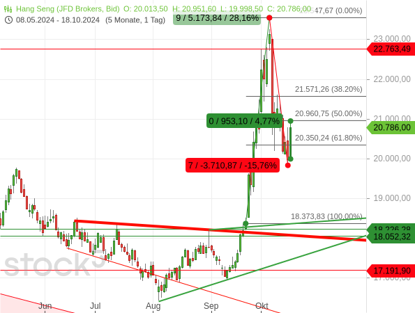 Insofern kamen die Programme der Zentralbank gestern genau zum richtigen Zeitpunkt. Vorgestern hatte der chinesische Aktienindex Hang Seng noch ein neues Korrekturtief markiert und damit mehr als 15 % vom jüngsten Hoch verloren. Und auch gestern startete der Markt zunächst in der Nähe des Tiefs und somit relativ schwach in den Tag. Doch dann ging es um mehr als 4,7 % nach oben.