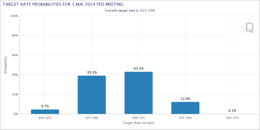 Getrieben ist die Rally dabei weiterhin von Spekulationen auf Zinssenkungen. Am Markt wird inzwischen mit einer Wahrscheinlichkeit von fast 90 % damit gerechnet, dass die US-Notenbank im Mai mindestens schon einen Zinsschritt nach unten gehen wird.