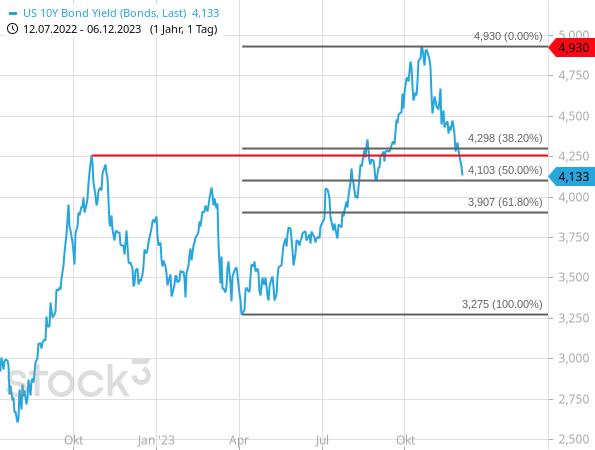Das hat die Rendite der 10-jährigen US-Staatsanleihen inzwischen deutlich unter das Hoch vom Oktober 2022 zurückgedrückt. Und sie hat damit nun schon fast die Hälfte der letzten Aufwärtsbewegung korrigiert.