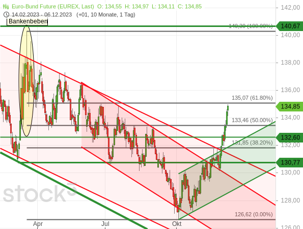 Mit anderen Worten: Die Zinsen bzw. Renditen werden wieder etwas zulegen, die Kurse am Anleihemarkt somit wieder ein wenig zurückkommen. Und vielleicht pendelt sich der Bund-Future dann irgendwo zwischen dem Oktober-Tief und dem Hoch der aktuellen Rally in eine Seitwärts- oder eine moderate Aufwärtstendenz ein. Und damit würde er dann dem Zinspfad der Notenbanken folgen. Wenn man es spekulativ mag, könnte man also nun auf einen Rücksetzer traden. Das gilt übrigens sowohl für den Anleihe- als auch für den Aktienmarkt.