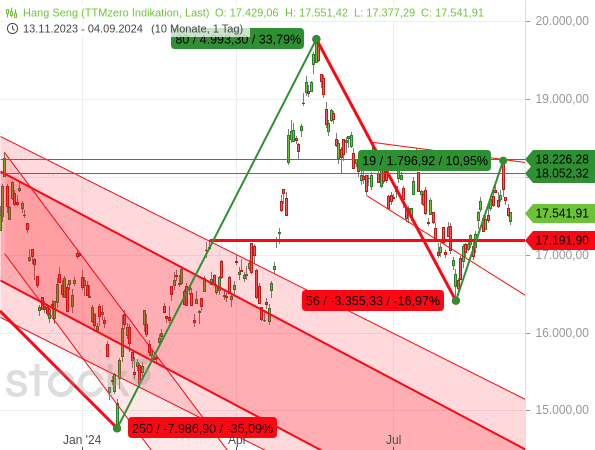 Vielleicht erinnern Sie sich noch – mit Blick auf den folgenden Chart des Hang Seng hatte ich am 23. Juli geschrieben, man solle auf das Hoch vom 13. März bei 17.191,90 Punkten achten. „Denn falls dieses unterschritten wird, trübt sich das Chartbild durch die Überschneidung der Wellen weiter ein“, hieß es dazu (siehe „Harris ersetzt Biden – Aktien profitieren, außer in China“).