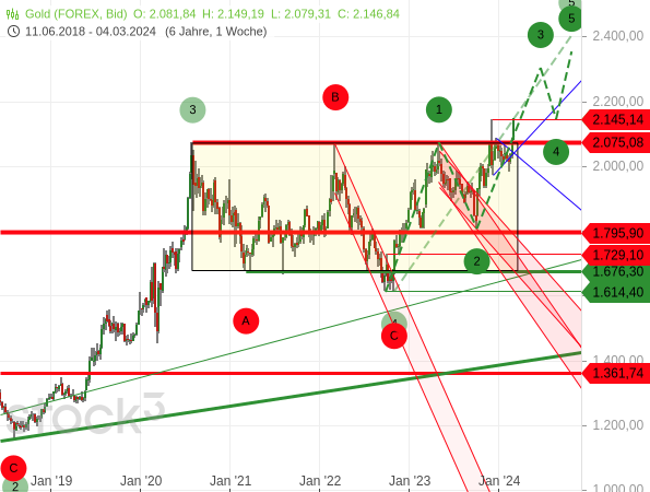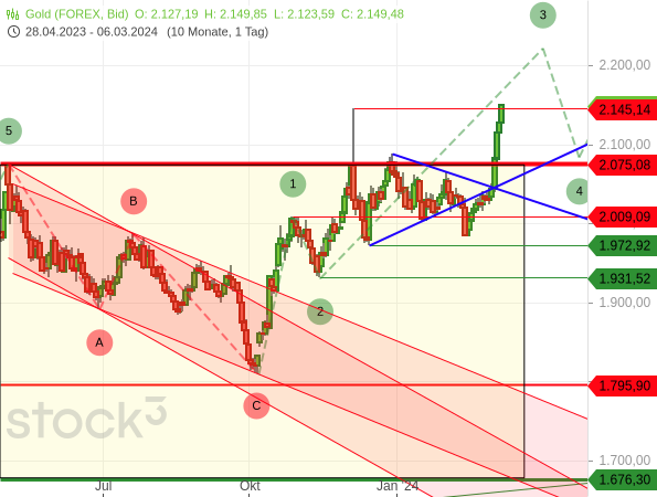 Begünstigt wurde diese Kursentwicklung durch das grundsätzlich bullishe Chartbild, in dem sich der Goldpreis aktuell befindet. Denn die große Seitwärtsbewegung hat nach den starken Kursgewinnen zuvor einen trendbestätigenden Charakter. Und auch aus Sicht der Elliott-Wellen befindet sich der Goldpreis in einem Aufwärtszyklus. Im übergeordneten Bild läuft schon seit dem Tief von Ende 2022 die Aufwärtswelle 5. Und von dieser Welle 5 bildet der aktuelle Anstieg die Welle 3.