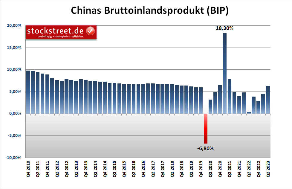 Die Woche begann am Montag mit einer erneuten schlechten Nachricht aus China. Das Wachstum der weltweit zweitgrößten Volkswirtschaft der Welt ist aufgrund der nachlassenden Nachfrage aus dem In- und Ausland (siehe dazu auch Börse-Intern vom vergangenen Donnerstag) langsamer gewachsen als erwartet. Im Jahresvergleich wuchs das Bruttoinlandsprodukt (BIP) im 2. Quartal 2023 „nur“ um 6,3 %, statt erwarteter +7,3 %.