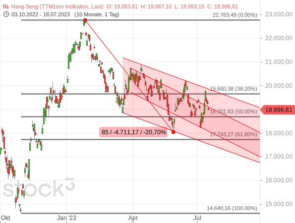 Wenn die Wirtschaft derart schwächelt, dass sich die Notenbank genötigt sieht, unterstützend einzugreifen, dann geht so eine Entwicklung selten spurlos am Aktienmarkt vorüber. Und so verwundert es nicht, dass der Hang Seng seit Ende Mai zwar kein neues Korrekturtief markiert hat, sich aber immer noch klar in einem Abwärtstrend befindet.