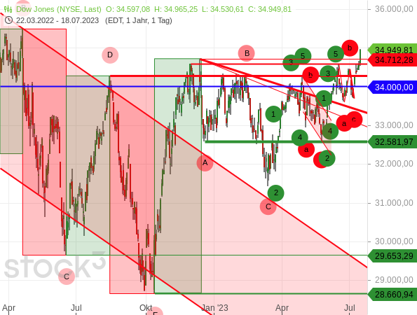 Und was machen die Aktienmärkte daraus? Der Nasdaq 100 gab zum offiziellen Handelsstart heute nur leicht nach. Und der Dow Jones brach sogar nach oben aus, konnte also das Hoch vom 13. Dezember bei 34.712,28 Punkten überwinden und notiert aktuell so hoch wie seit dem 21. April 2022 nicht mehr.