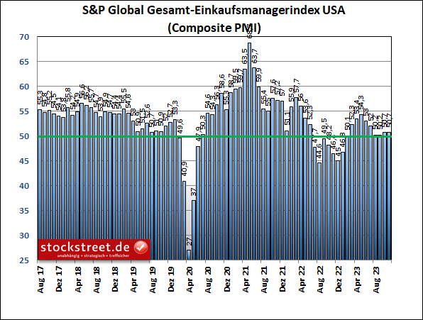 Er befindet sich damit nun den 4. Monat in Folge nur leicht oberhalb der Schwelle von 50 Punkten, ab der Wachstum signalisiert wird. Dabei legte der Dienstleistungssektor leicht zu (von 50,6 auf 50,8), im verarbeitenden Gewerbe fiel der Wert hingegen leicht unter die 50er Wachstumsschwelle.