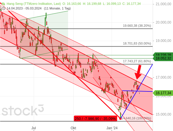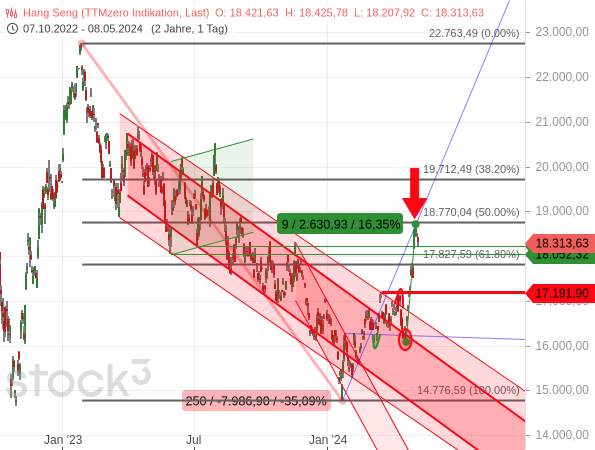 Allerdings gibt es noch ein Restrisiko. Denn der Hang Seng hat mit dem aktuellen Hoch exakt 50 % der Abwärtsbewegung korrigiert (siehe roter Pfeil im folgenden Chart). Und damit gilt die aktuelle Aufwärtsbewegung noch als normale Gegenbewegung.