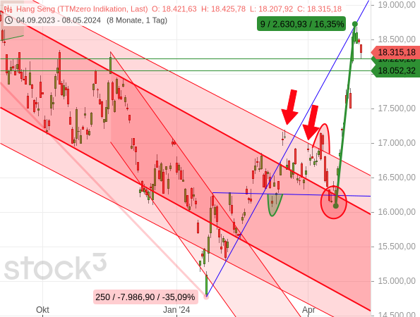 Wie könnte es aber nun mit den Hang Seng weitergehen? Angesichts der hohen Aufwärtsdynamik des aktuellen Kursanstiegs und des klaren Bruchs des Abwärtstrend(kanal)s würde ich die Korrektur, die den Index seit Anfang 2023 mehr als 35 % gekostet hat, als beendet ansehen.