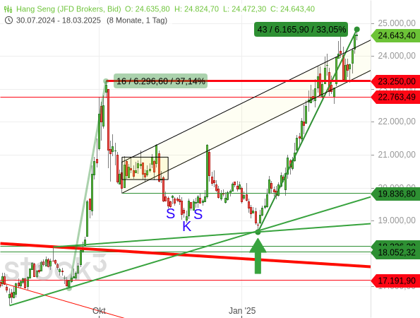 Zwar gab der Hang Seng anschließend noch bis ins Jahr 2025 nach und markierte sogar noch ein neues Korrekturtief, eine wichtige Kreuzunterstützung verhalf dem Index ab dem 13. Januar aber zu einer Trendwende (siehe grüner Pfeil im folgenden Chart).