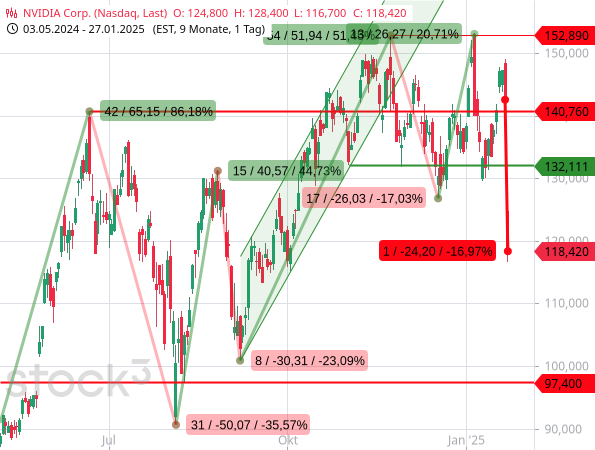Wie sehr diese Blase aufgepumpt ist, hat wieder einmal Nvidia gezeigt, indem das Unternehmen den nächsten Rekord aufgestellt hat, diesmal allerdings erneut einen negativen. Mit seinem vorgestrigen Kurssturz um letztlich rund 17 % haben sich fast 600 Milliarden US-Dollar Börsenwert in Luft aufgelöst (exakt 592,7). Das ist der größte Tagesverlust, den ein Unternehmen an der Wall Street je hinnehmen musste.