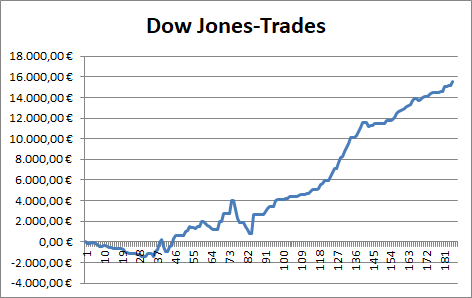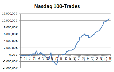 Zuvor hatte ich einen solchen Long-Trade, eingegangen am 20. Dezember bei 20.965 Punkten, am 16. Januar bei 21.310 Zählern mit einem Gewinn von 355,08 € erfolgreich beendet. Die Performance aller bislang beendeten Nasdaq 100-Trades hatte dadurch mit mehr als 10.500 € realisierten Gewinnen ein neues Hoch erreicht.