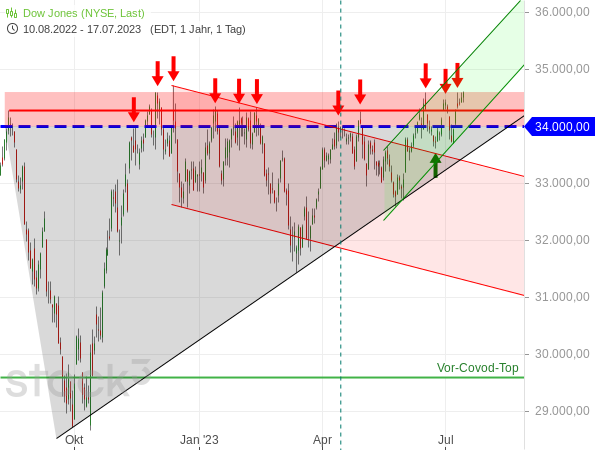 Wie Sie sehen, ist der Index seitdem mehrere Male im Bereich des Zwischenhochs von Mitte August 2022 oberhalb der runden 34.000-Punkte-Marke gescheitert. Dadurch hat sich eine breite Widerstandszone (rot schattiert) gebildet, deren Oberkante ich in den Bereich um 34.590 Punkten gelegt habe, deren höchster Punkt aber auch mehr 34.700 Punkte erreicht.