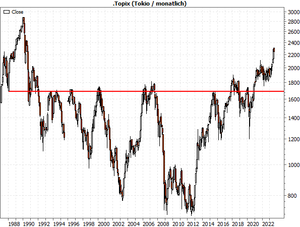 Er geht zurück auf eine alte Unterstützung vom Januar 1988 (!) bei 1.700 Punkten, die in der Rally bis 1990 gebildet wurde. Nachdem der Index Anfang 1992 endgültig die Unterstützung brach, scheiterten etliche Anläufe, zwischen denen der Kurs aber immer wieder stark zurückgeworfen wurde. Erst im November 2020, also nach fast 29 Jahren (!), gelang es dem Topix, seinen „Deckel“ zu durchbrechen.