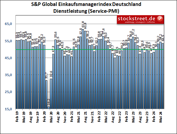 Erfreulich ist auch, dass sich der Dienstleistungsbereich in Deutschland im Juni den dritten Monat in Folge auf Wachstumskurs befindet, auch wenn der entsprechende Einkaufsmanagerindex ebenfalls nachgegeben hat.