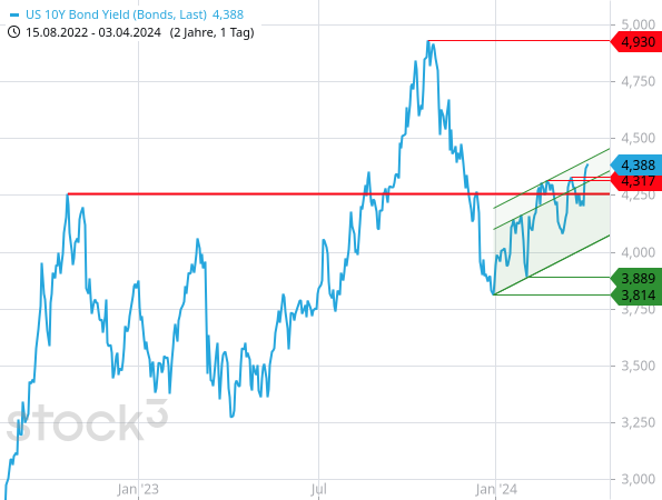 Genau diese Frage scheint sich auch der Anleihemarkt gestellt zu haben. Und er kam zu der Antwort, dass es kaum ein Argument gegen weiter steigende Preise und somit einen anhaltend hohen Leitzins der Fed gibt. Entsprechend sind die Renditen gestiegen. Die vom Markt stark beachtete 10-jährige US-Staatsanleihe rentierte mit fast 4,39 % so hoch wie seit mehr als 4 Monaten nicht mehr.