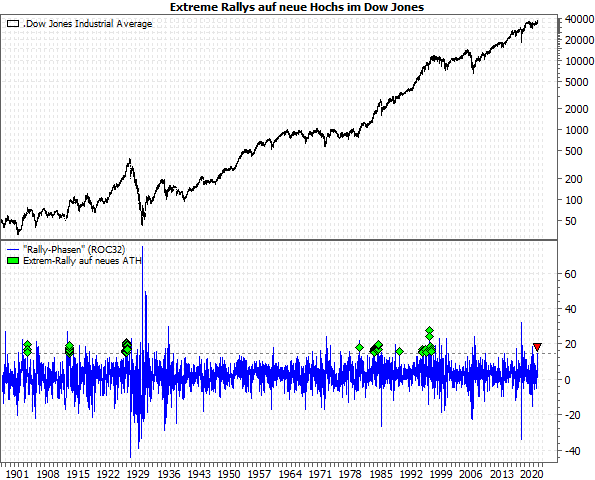 Noch seltener gelang es ihm, dabei ein neues Allzeithoch zu erreichen. Das ist auch logisch, denn sehr häufig kommen derart starke Anstiege als Gegenreaktion auf einen vorherigen Rückfall vor. Und eine solche Gegenreaktion erreicht dann nur selten ein neues Allzeithoch. Der folgende Chart veranschaulicht das für den Zeitraum seit 1900: