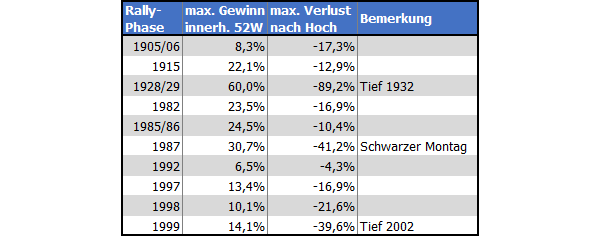 In der folgenden Tabelle habe ich daher für diese 10 Phasen die maximalen Gewinne notiert, die er bis zum nächsten markanten Hoch in diesem Zeitraum einfuhr und die Verluste, die danach bis zum darauffolgenden markanten Tief aufliefen. In Einzelfällen kam es erst (deutlich) später als nach 52 Wochen zu diesem Tief (siehe Spalte „Bemerkung“).