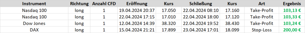Zudem ist das schon der vierte realisierte Gewinn in dieser Woche. Denn vorgestern wurden bereits drei Trades auf die US-Indizes jeweils durch Erreichen des Take-Profits erfolgreich beendet.