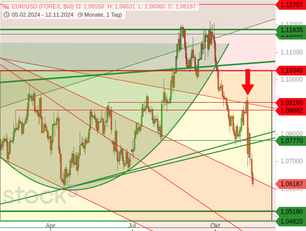 Ein weiterer Grund ist der seit der Wahl stark steigende US-Dollar (siehe roter Pfeil im folgenden Chart).
