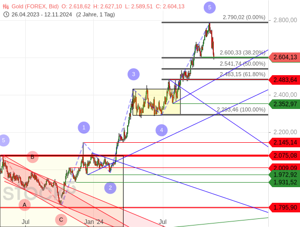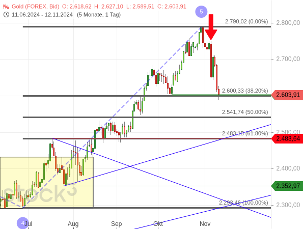 Der Goldpreis hat im November deutlich nachgegeben. Vor allem seit den US-Präsidentschaftswahlen geht es kräftig abwärts (siehe roter Pfeil im folgenden Chart).