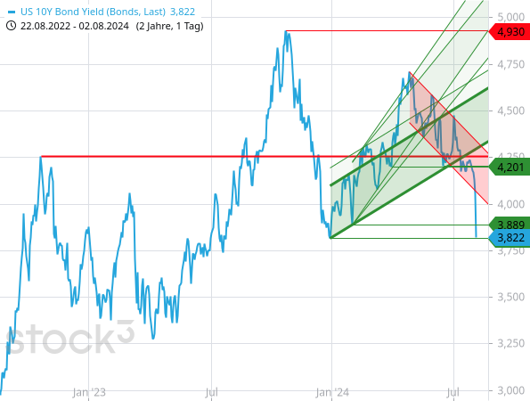 Man kann es sich daher leicht ausmalen, wie die erste Reaktion der Anleger auf die Arbeitsmarktdaten ausfiel: Sichere Häfen wie Anleihen waren gefragt, was deren Kurse steigen und Zinsen fallen ließ. Die Rendite der vom Markt vielbeachteten 10-jährigen US-Staatsanleihe brach förmlich ein und notiert nun in der Nähe des Tiefs vom Dezember 2023.