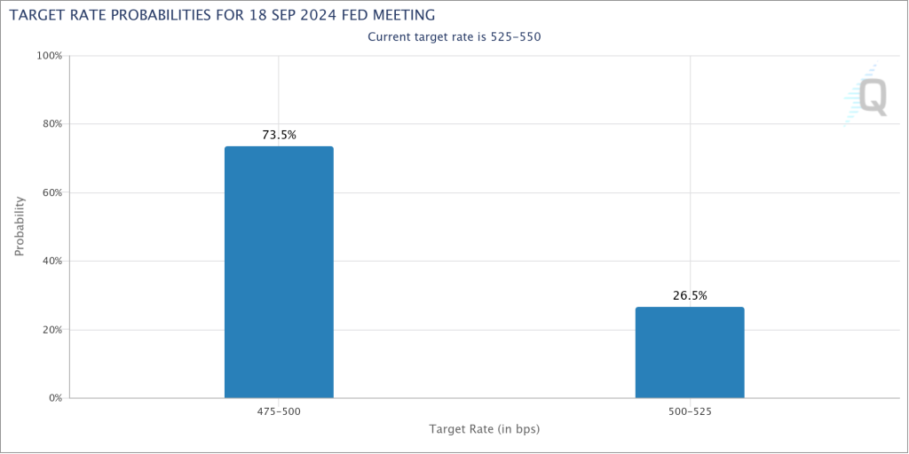 So verwundert es auch nicht, dass die Wahrscheinlichkeit für eine 50-Punkte-Zinssenkung im September nach den aktuell schwachen Wirtschaftsdaten explodiert ist, von vorgestern noch nur 22 % auf aktuell 73,5%.