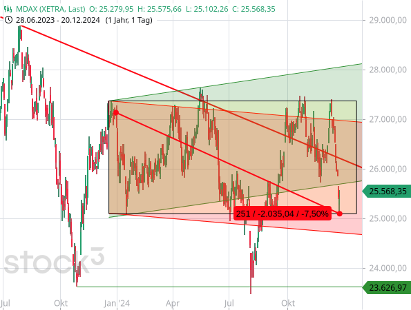 Der MDAX lag damit am gestrigen Tagestief seit Jahresbeginn schon wieder 7,5 % im Minus. Nun kommt es stark darauf an, ob die Seitwärtsrange trotz des scharfen Angriffs nachhaltig verteidigt werden kann.