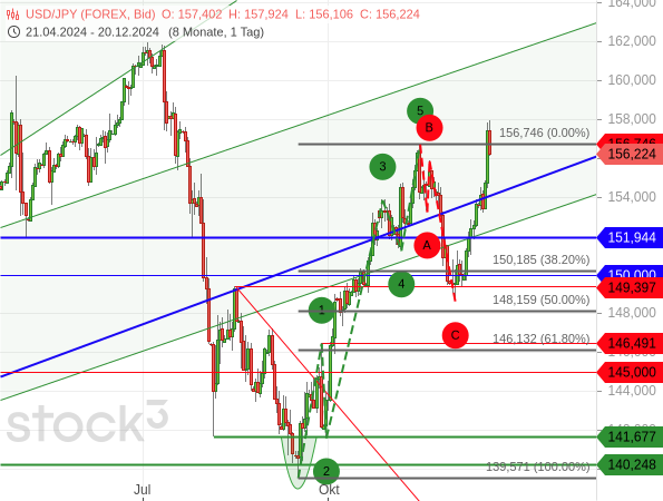 Und die Enttäuschung über den ausbleibenden Zinsschritt zeigte sich am Devisenmarkt durch einen deutlich schwächeren Yen. Dies auch vor dem Hintergrund, dass die US-Notenbank ihren Leitzins zwar kurz zuvor gesenkt hatte, für 2025 aber zugleich nur noch halb so viele Zinssenkungen wie bislang andeute (2 statt 4, siehe „Lieferte die Fed den Sargnagel für die diesjährige Rally?“). Das stärkte den US-Dollar und ließ den Yen im Verhältnis zusätzlich schwächeln. Der USD/JPY übersprang sogar das Hoch vom 15. November bei 156,746 Yen.