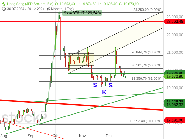 Der chinesische Aktienindex Hang Seng hat sich daher im Bereich der Bodenbildung in Form einer inversen SKS-ähnlichen Formation eingependelt.