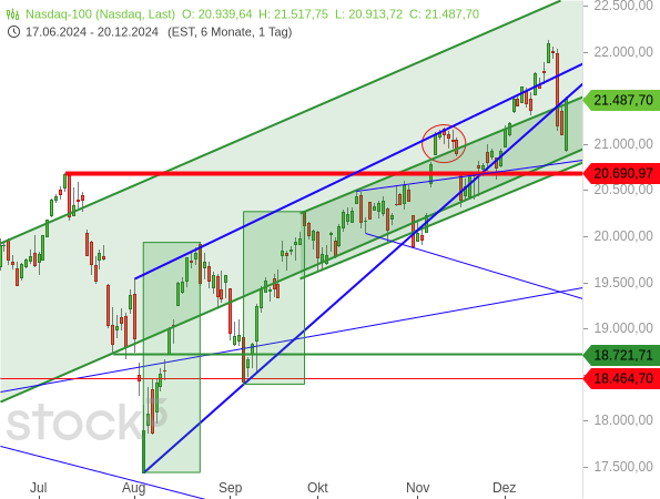 Jedenfalls: Fällt der Technologieindex deutlich unter das alte Rekordhoch und werden damit zugleich die Aufwärtstrendkanäle (grün) in hohem Tempo gebrochen, liegen zahlreiche bearishe Signale vor. Und dann dürften es die Bullen schwerer haben, zurück ins Spiel zu kommen. Man muss wohl erst einmal abwarten, bis sich die Kurse beruhigt haben.