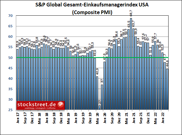 Der Rückgang zum Juli-Wert fällt mit -3,1 Punkten doppelt so hoch aus wie bei den Daten für die deutsche Wirtschaft. Hauptgrund dafür sind die schwächelnden Dienstleistungsunternehmen, die auf einen Indexwert von gerade einmal noch 43,7 kommen. Und mit Blick auf die obige Grafik scheint die US-Wirtschaft im freien Fall.
