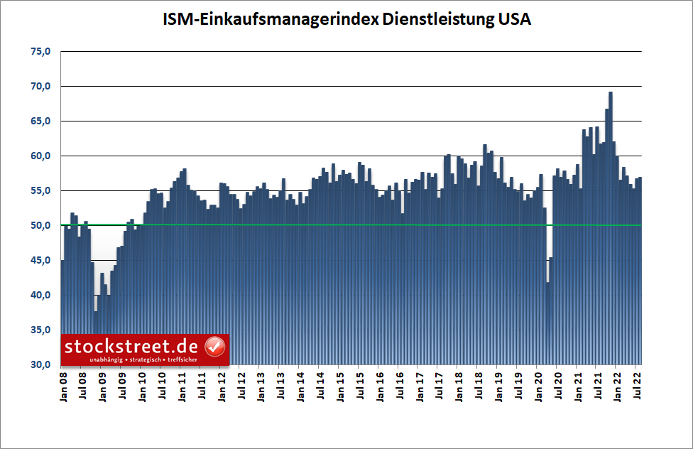 Völlig unklar, wie man vor diesem Hintergrund den ISM Einkaufsmanagerindex Dienstleistung werten soll, der gestern vom Institute for Supply Management (ISM) veröffentlicht wurde. Demnach legte dieser Stimmungsindikator sogar von 56,7 Punkten im Juli um +0,2 auf 56,9 im August zu.
