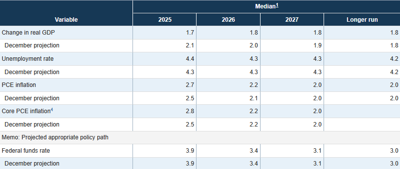 Denn dass die Handelspolitik von US-Präsident Donald Trump mit seinen Zöllen das Wirtschaftswachstum tendenziell belastet und die Inflation anheizt, war hinlänglich bekannt. Und so ist es nur logisch, dass die Fed-Volkswirte ihre Prognose für das Wachstum nach unten und die für die Inflation nach oben revidiert haben. Der Median der Wachstumsvorhersage für das Jahr 2025 wurde allerdings recht deutlich von zuvor 2,1 % auf 1,7 % heruntergeschraubt.