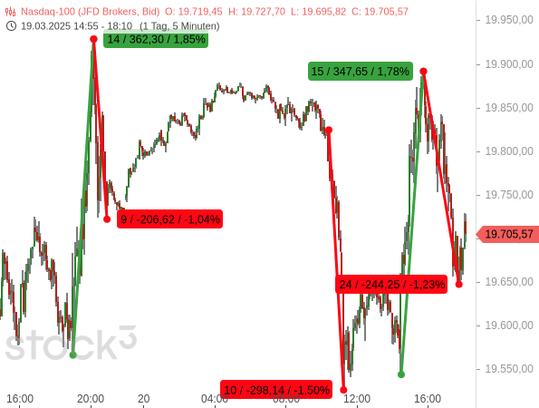 Nach einem nächtlichen Kursanstieg brach der Technologieindex dann gestern ab ca. 10:25 Uhr um fast 300 Punkte bzw. 1,5 % ein, nur um mit Beginn des offiziellen US-Handels um fast 350 Punkte bzw. 1,78 % nach oben zu schießen und anschließend einen Großteil auch dieser Kursgewinne wieder abzugeben (-244 Punkte bzw. -1,23 %).