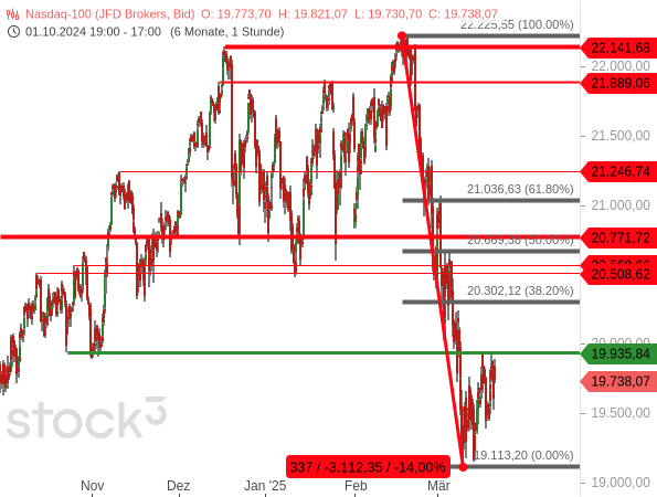 Selbst das 38,20%-Fibonacci-Retracement scheint damit noch in weiter Ferne. Der Index zeigt somit deutliche Schwäche. Die Kurserholung droht in sich zusammenzubrechen, wenn nicht bald ein (möglichst dynamischer) Ausbruch über die 19.935er Marke gelingt.