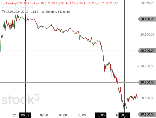 Die US-Technologiewerte haben relativ stark nachgegeben. Zunächst bröckelten die Kurse bis um 8:00 Uhr gestern früh (MESZ) kontinuierlich ab, dann beschleunigte sich die Abwärtsbewegung. Der Nasdaq 100 verlor zum Beispiel bis 8:00 Uhr rund 100 Punkte und sank damit von rund 20.400 auf 20.300 Zähler, dann rutschte er binnen 1,5 Stunden um weitere 200 auf 20.100 Punkte ab.