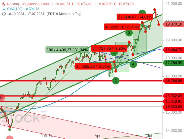 Wobei die Bullen trotzdem noch genug zu Lachen haben. Schließlich notiert der Nasdaq 100 immer noch auf sehr hohem Niveau. Doch womöglich hat nun eine schärfere Korrektur begonnen.