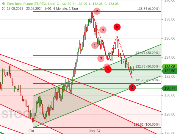 Die Anleihekurse sind im Gegenzug entsprechend gefallen – auch hierzulande: Der Bund-Future ist inzwischen unter das 50%-Fibonacci-Retracement bei 132,73 Punkten gerutscht und erreichte das niedrigste Niveau seit Ende November.