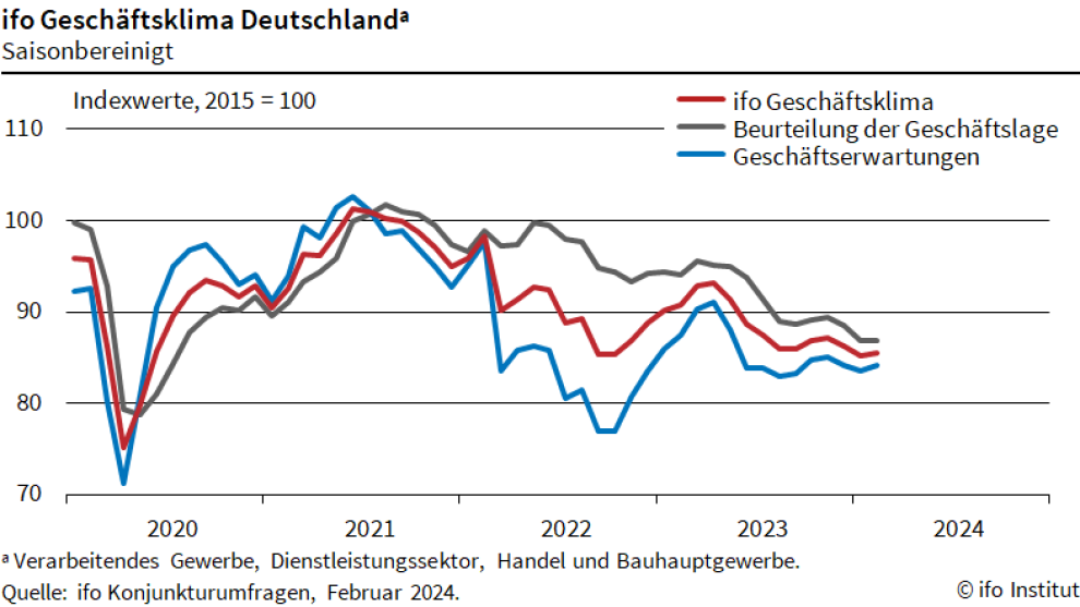 Laut dem ifo-Geschäftsklima hat sich die Stimmung in den Chefetagen der deutschen Wirtschaft im Februar leicht aufgehellt. Das Stimmungsbarometer stieg auf 85,5 Punkte, von 85,2 Zählern im Vormonat, da die Unternehmen zwar ihre aktuelle Geschäftslage so schlecht wie im Januar, aber ihre Aussichten für die kommenden Monate etwas besser beurteilten.