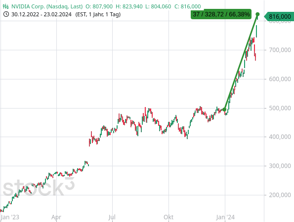 - Seit Jahresbeginn hat der Aktienkurs (binnen nur 37 Handelstagen) um zwei Drittel bzw. mehr als 66% zugelegt, womit NVIDIA für mehr als ein Viertel des S&P 500-Anstiegs im Jahr 2024 verantwortlich ist.