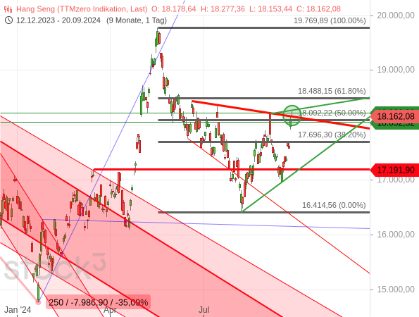Zudem wurde das Hoch vom 30. August überschritten, aber ebenfalls noch nicht nachhaltig. Mit dem höheren Hoch und dem zuvor gebildeten höheren Tief (grüne Linien) liegt nun trotzdem eine Aufwärtstendenz vor. Die vorherige scharfe Korrektur scheint damit beendet. Bestätigt wird dies, wenn die Kurse über das 61,80%-Fibonacci-Retracement dieser Korrektur bei 18.488,15 Punkten klettern können. Zumal dann auch die vorherigen Zwischenhochs überwunden sind.