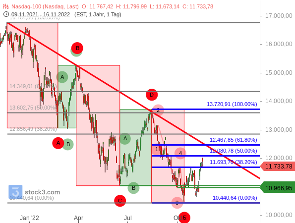 Der Nasdaq 100 konnte hingegen seine aktuelle Fibonacci-Hürde – das 38,20%-Retracement der dritten Korrekturwelle – überwinden und sich zur 50%-Marke vorarbeiten (blaue Linien). Allerdings war auch dieser Vorstoß bescheiden und offenbar wenig nachhaltig.